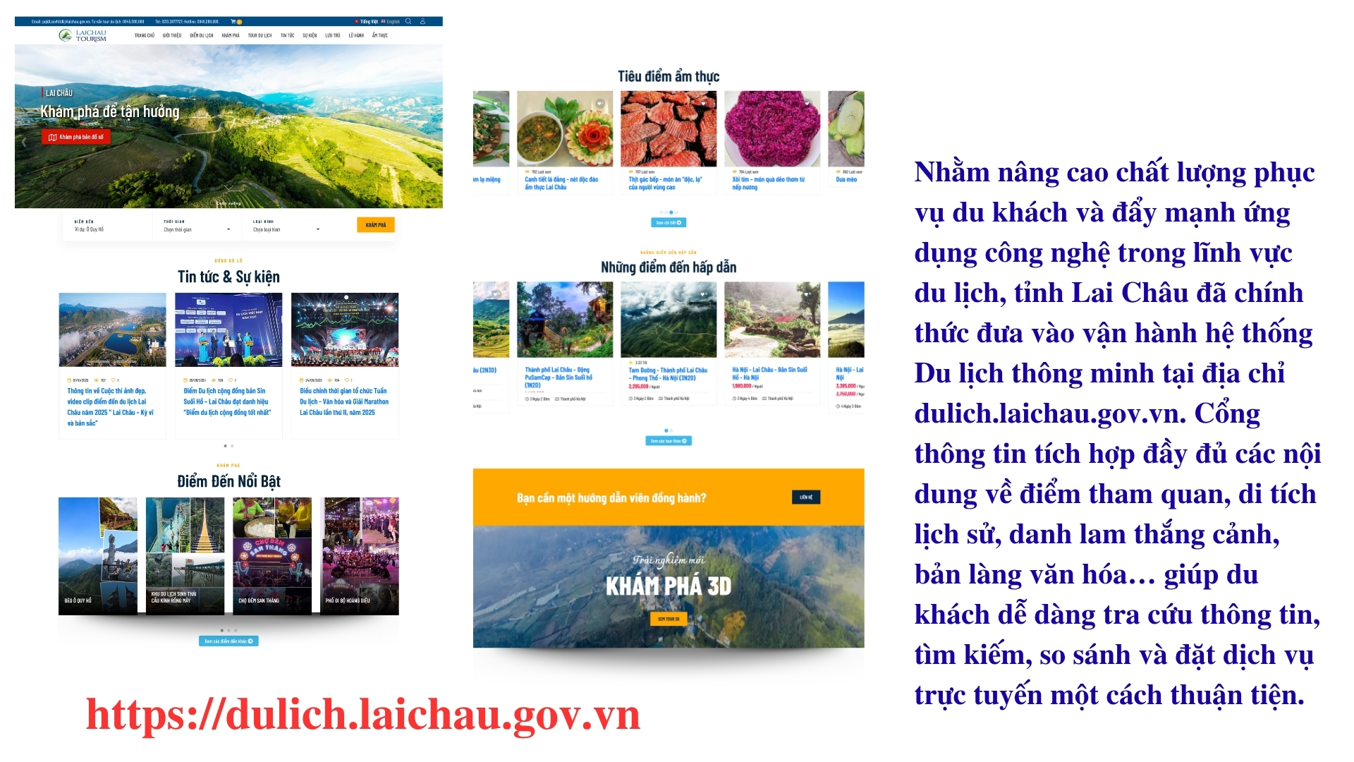 Cùng với việc phát triển Cổng du lịch thông minh tại địa chỉ dulich.laichau.gov.vn, tỉnh Lai Châu đã tích cực mở rộng hệ sinh thái du lịch số bằng cách tích hợp nền tảng này trên các thiết bị di động, cho phép du khách dễ dàng tải ứng dụng từ Google Play để tìm hiểu thông tin trước, trong và sau chuyến đi. Các công nghệ hiện đại như thực tại ảo (VR), thực tại tăng cường (AR), thực tại trộn (MR), video 360 độ và video tương tác trực tuyến cũng được áp dụng, mang đến cho du khách cơ hội trải nghiệm điểm đến một cách sinh động trước khi đưa ra quyết định. Đặc biệt, ứng dụng được tích hợp trên nền bản đồ số, hỗ trợ theo dõi hành trình, cảnh báo an toàn, tiếp nhận phản hồi và chủ động cung cấp thông tin hữu ích như: địa danh, phương tiện di chuyển, ẩm thực, lưu trú, mua sắm, nhật ký du lịch, mua vé... Việc đẩy mạnh ứng dụng công nghệ không chỉ nâng cao chất lượng dịch vụ mà còn tạo thuận lợi tối đa cho du khách trong suốt hành trình khám phá Lai Châu.