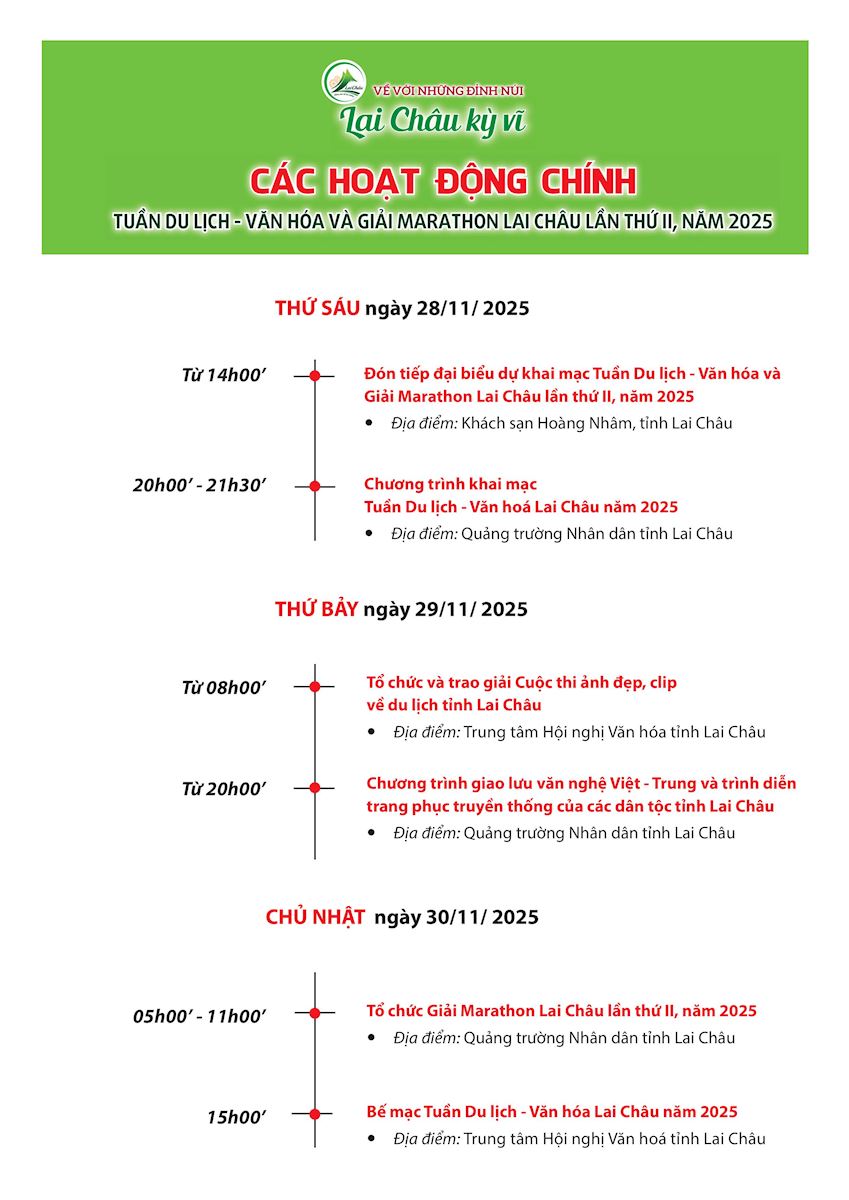 Tuần Du lịch – Văn hóa và giải Marathon Lai Châu lần thứ II, năm 2025 dự kiến diễn ra trong 3 ngày (từ ngày 28/11 - 30/11/2025) với rất nhiều hoạt động đặc sắc. Xin giới thiệu tới đại biểu, Nhân dân và du khách các hoạt động của sự kiện này.