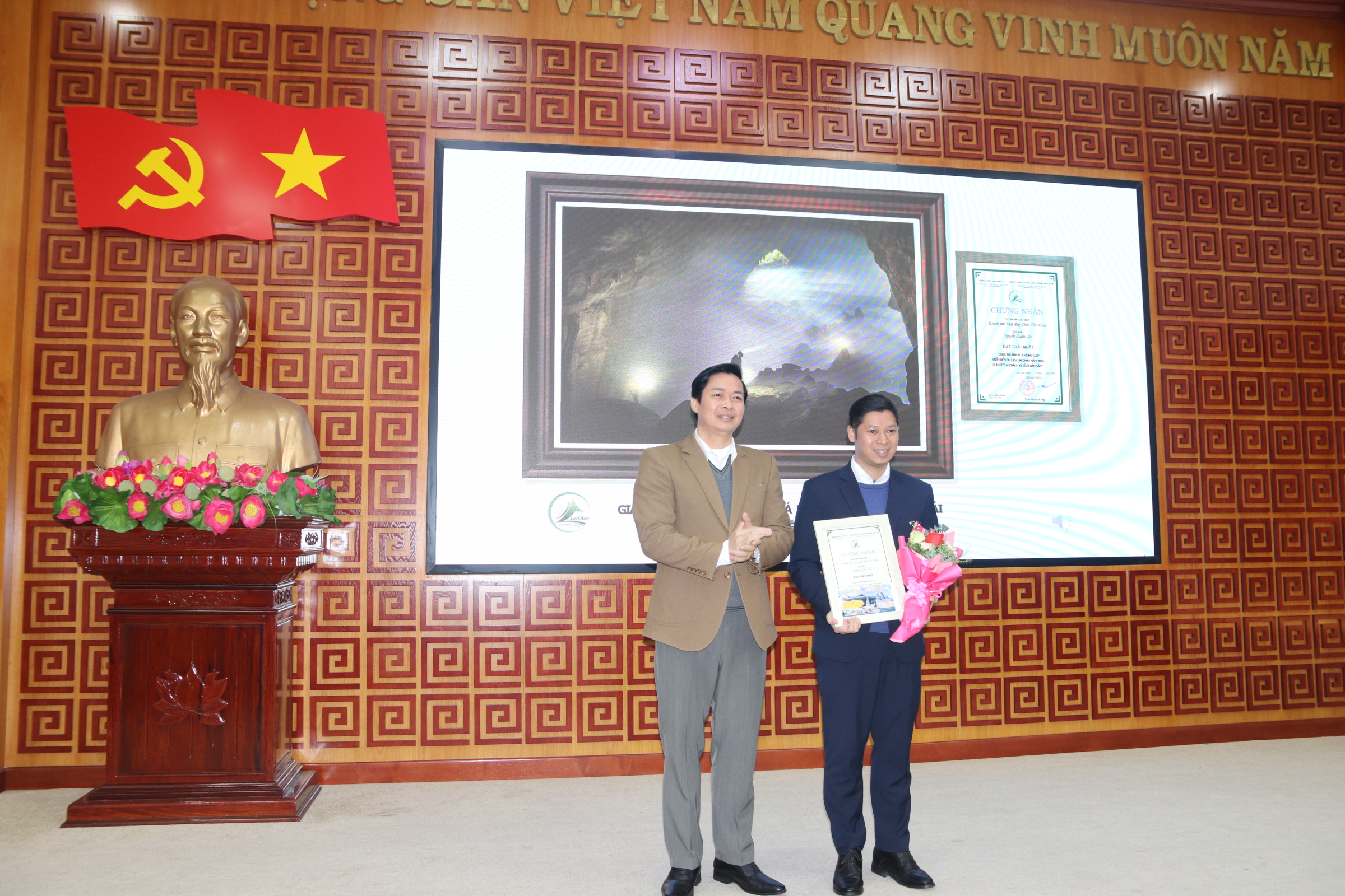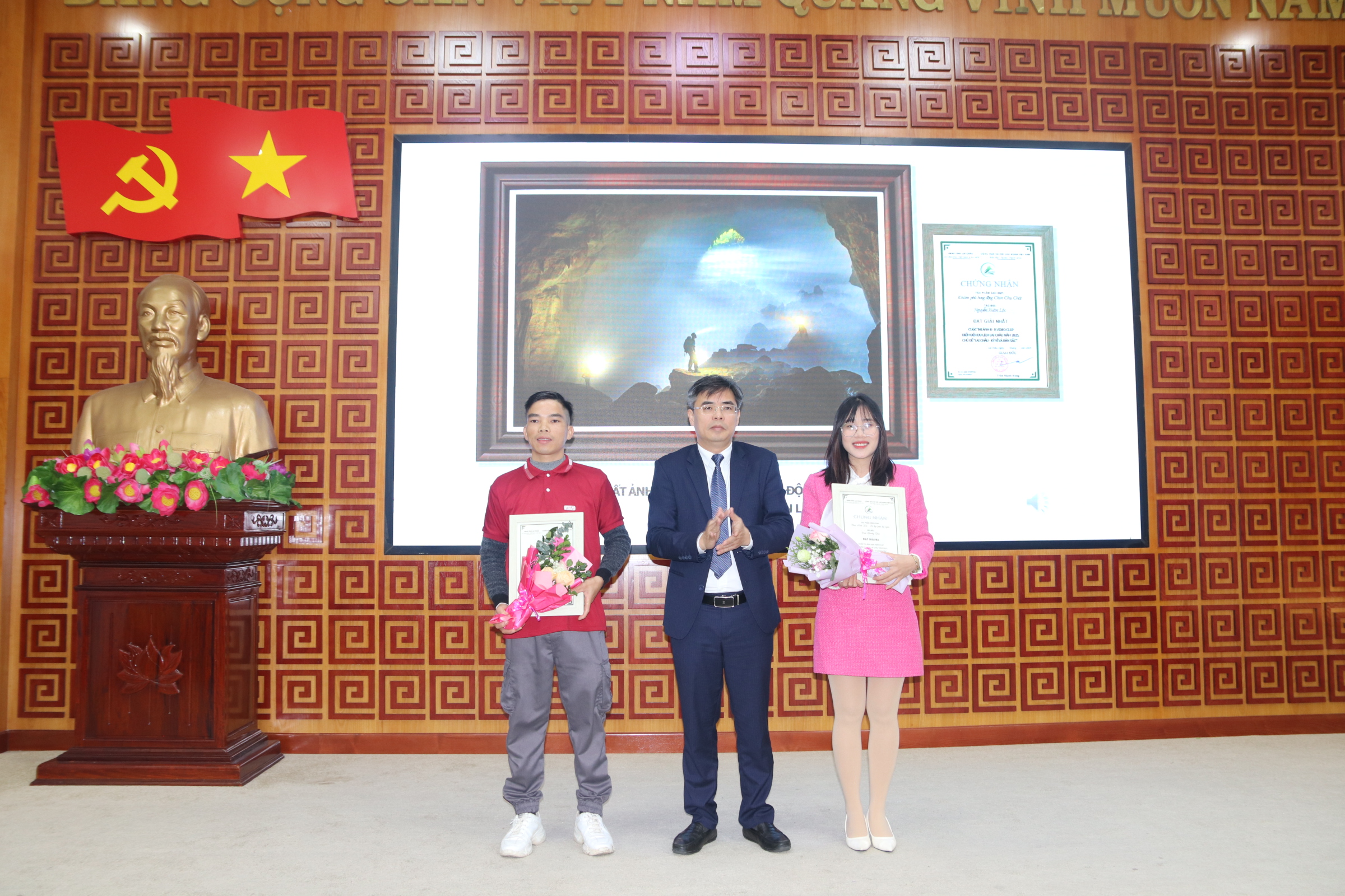 Đồng chí Nguyễn Đình Toán, Phó Trưởng ban Tuyên giáo và Dân vận Tỉnh ủy, Phó Trưởng Ban Tổ chức, trao giải Nhất cho tác phẩm ảnh “Khám phá Động Chin Chu Chải” của tác giả Nguyễn Xuân Lộc.