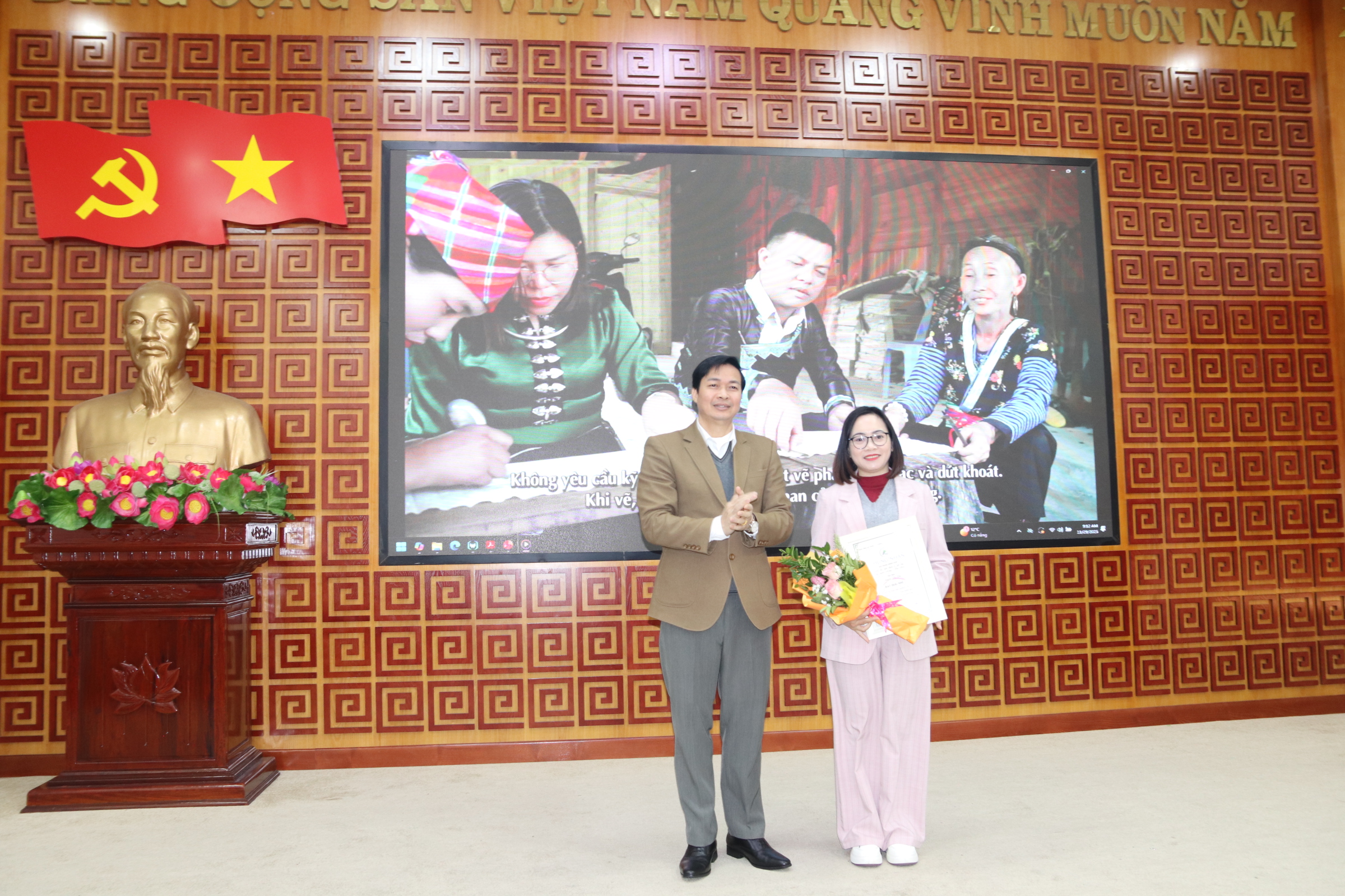 Đồng chí Nguyễn Đình Toán, Phó Trưởng ban Tuyên giáo và Dân vận Tỉnh ủy, Phó Trưởng Ban Tổ chức, trao giải Nhì cho tác phẩm video clip“Độc đáo nghệ thuật vẽ sáp ong của người Mông ở Pha Mu” của tác giả Nguyễn Thị Thu.