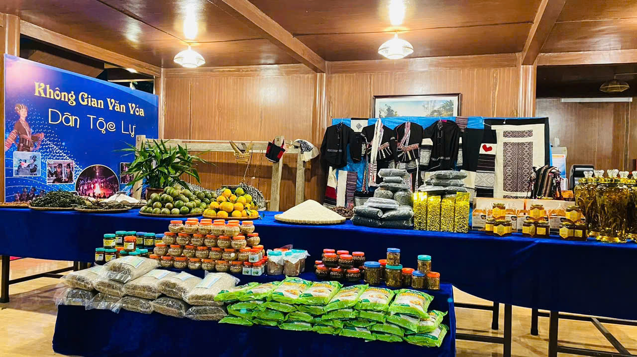 Du khách có dịp tham quan, mua sắm các sản phẩm văn hoá, sản phẩm OCOP, sản phẩm nông sản địa phương tại không gian bán, trưng bày sản phẩm văn hoá dân tộc Lự