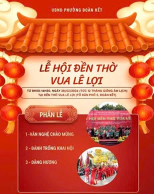 Ngày 28/02/2026 (tức 12 tháng Giêng năm Bính Ngọ), tại Đền thờ Vua Lê Lợi, phường Đoàn Kết, Lễ hội Đền thờ Vua Lê Lợi Xuân Bính Ngọ 2026 sẽ được tổ chức với sự tham gia của đông đảo Nhân dân và du khách thập phương.